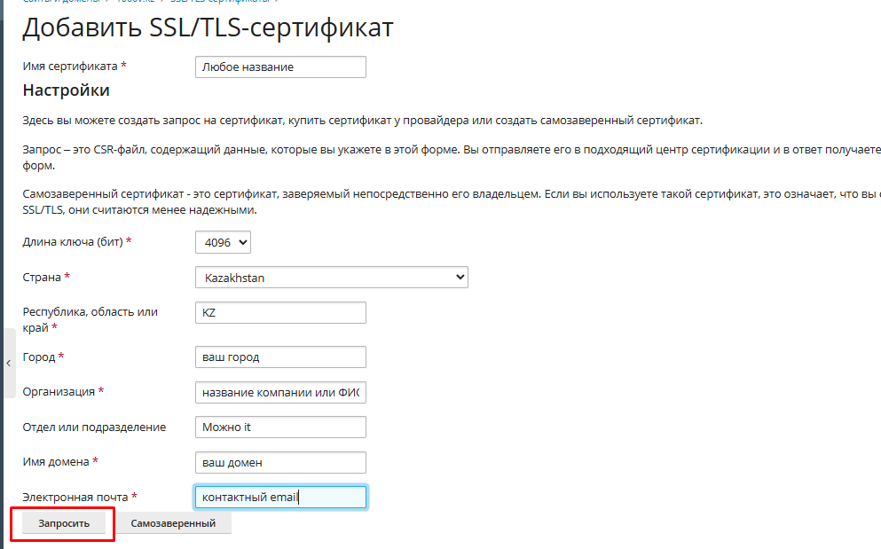 Выберите раздел “Добавить SSL/TLS сертификат“, заполните форму латинскими буквами без спецсимволов.