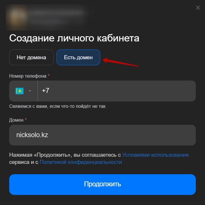Во всплывшем окне выберите вкладку Есть домен, введите Номер телефона и Домен.