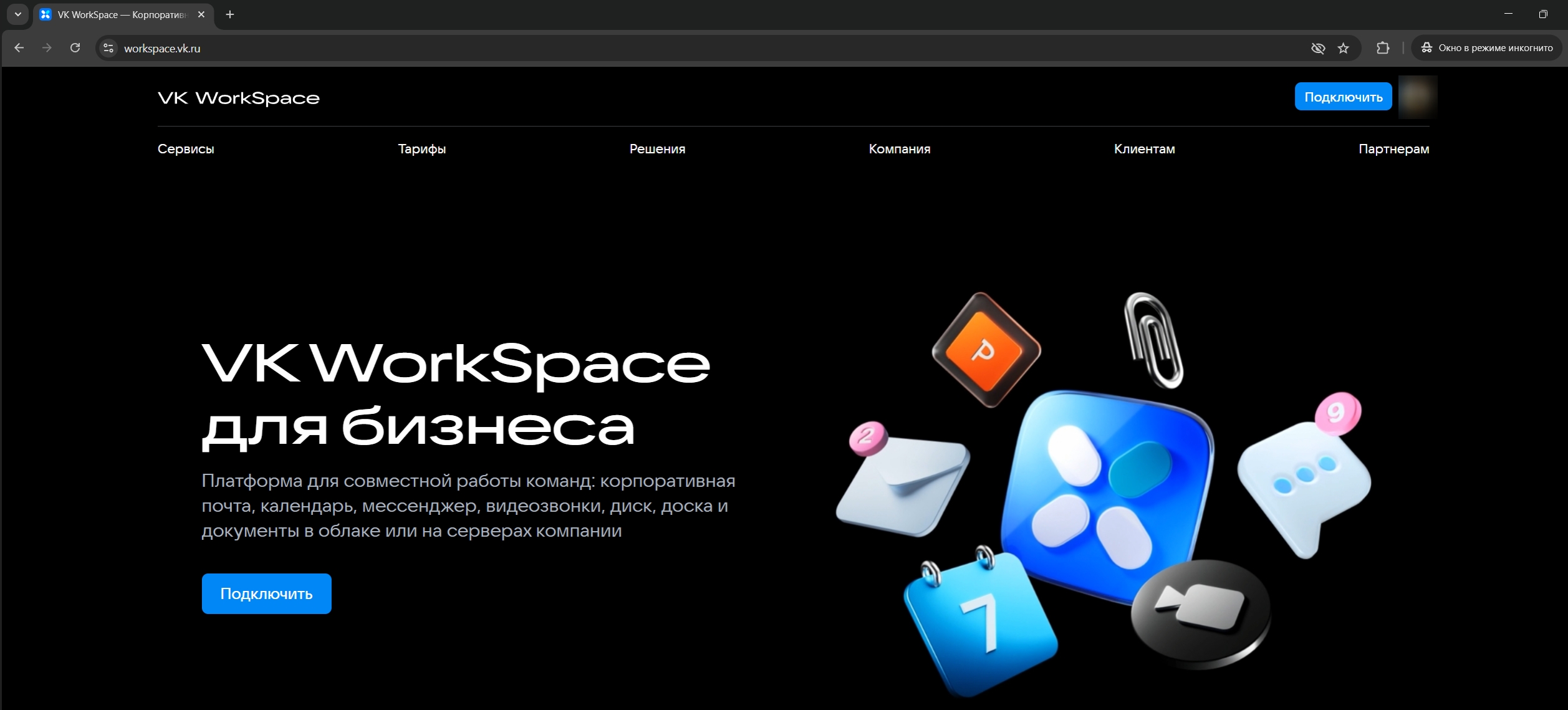 - Для подключения домена на mail.ru откройте страницу https://workspace.vk.ru/, выполните вход и нажмите кнопку Подключить.