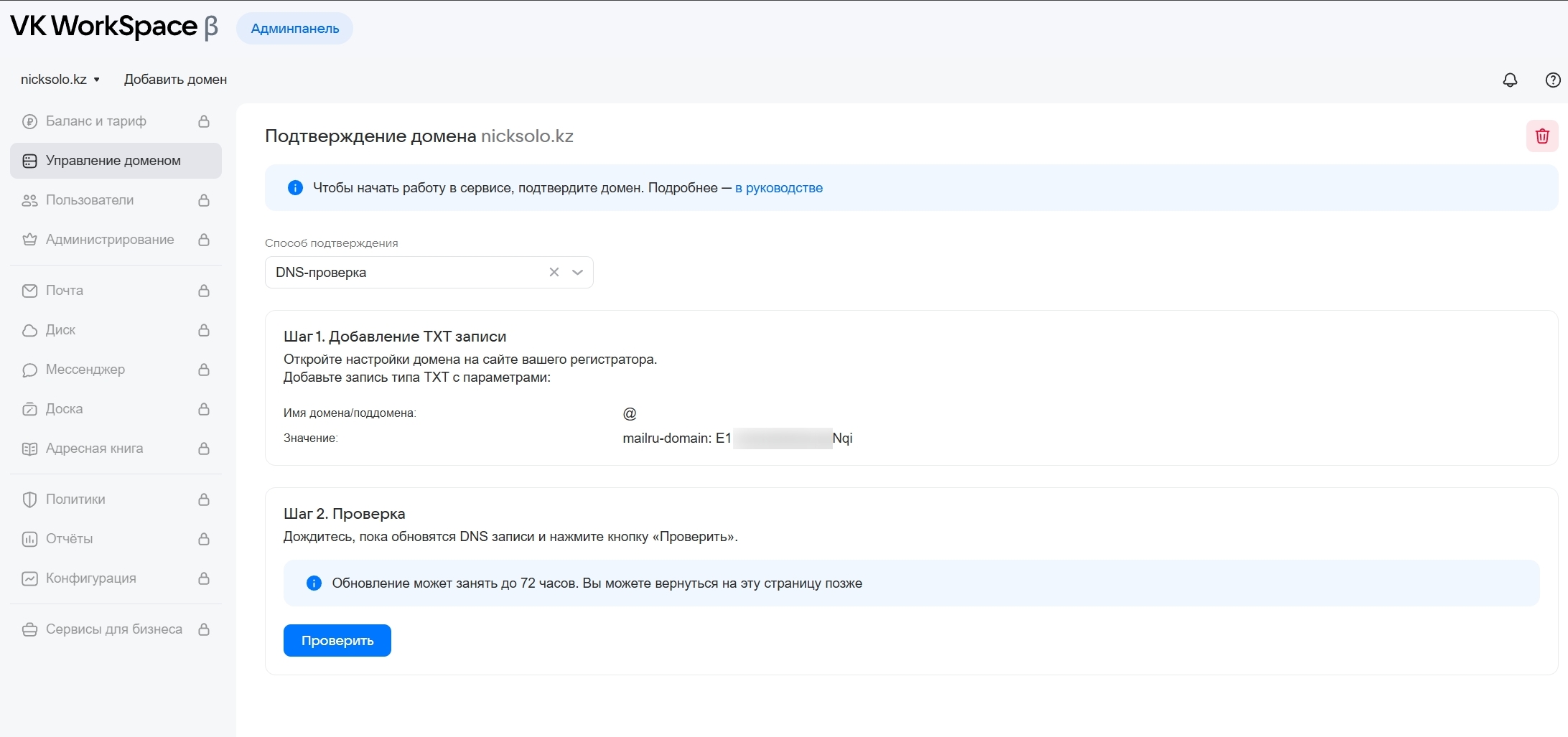 - На открывшейся странице будет представлено несколько вариантов прохождения проверки владения доменом, вам необходимо выбрать DNS-Проверка, в которой нужно создать TXT-Запись с указанным содержанием