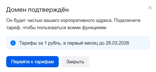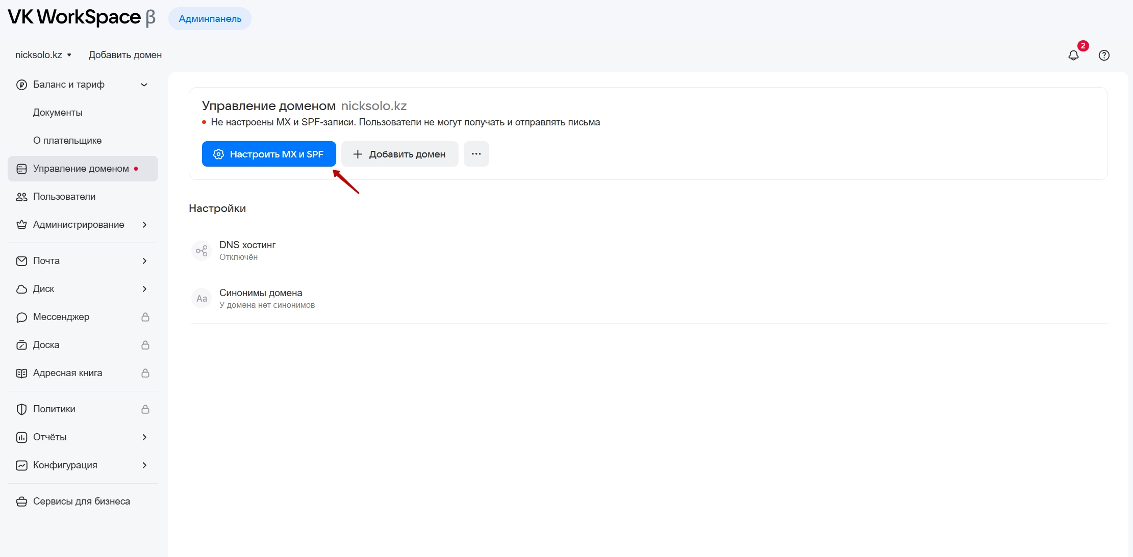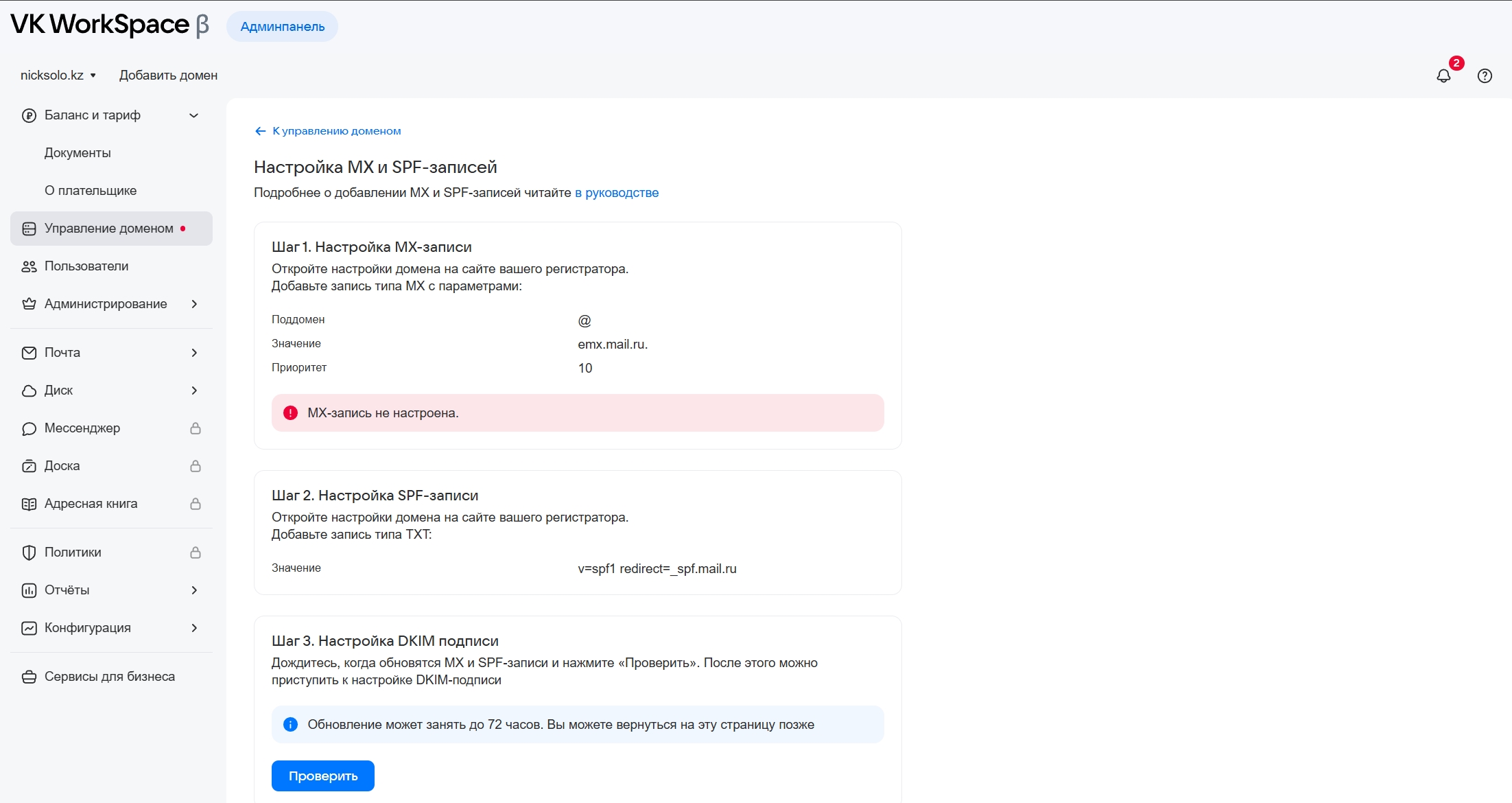 - Как только валидация домена будет пройдена, откроется инструкция для настройки необходимой для работы почты MX и SPF записей.