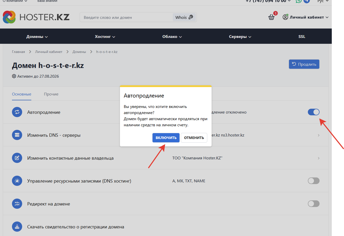 Как включить автоматическое продление домена: