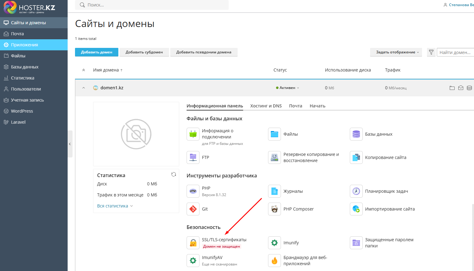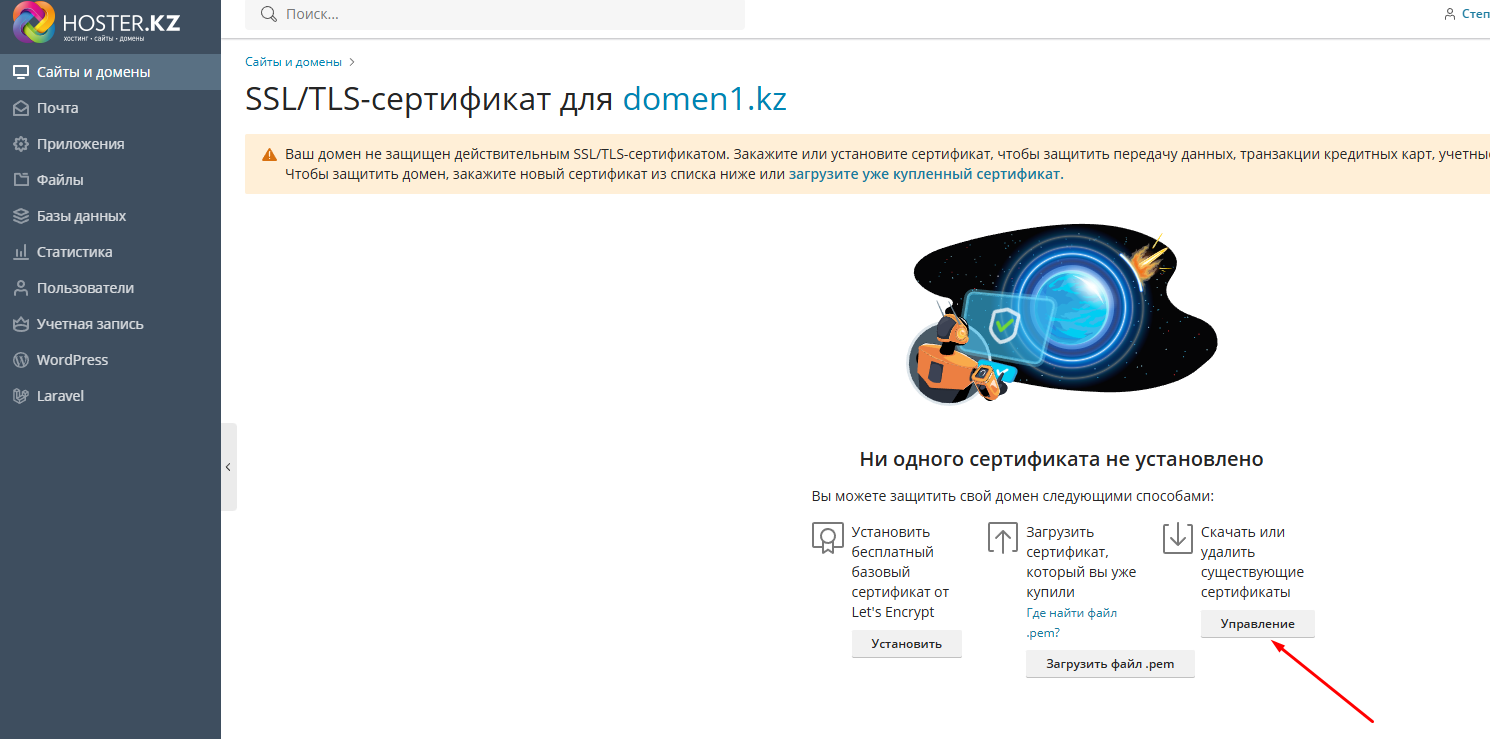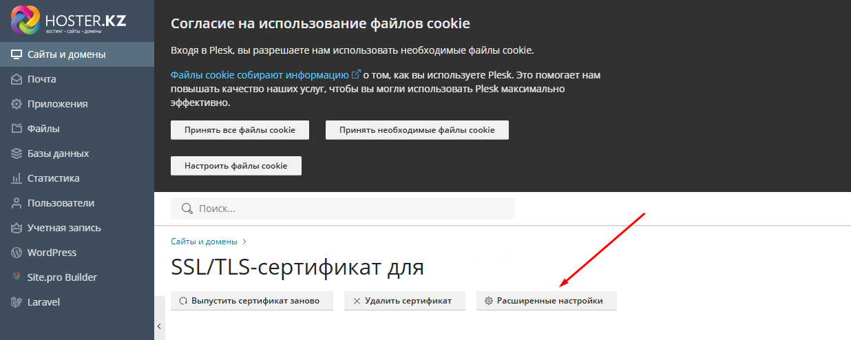 В разделе "Сайты и домены" откройте меню, вкладка SSL/TLS-сертификаты.